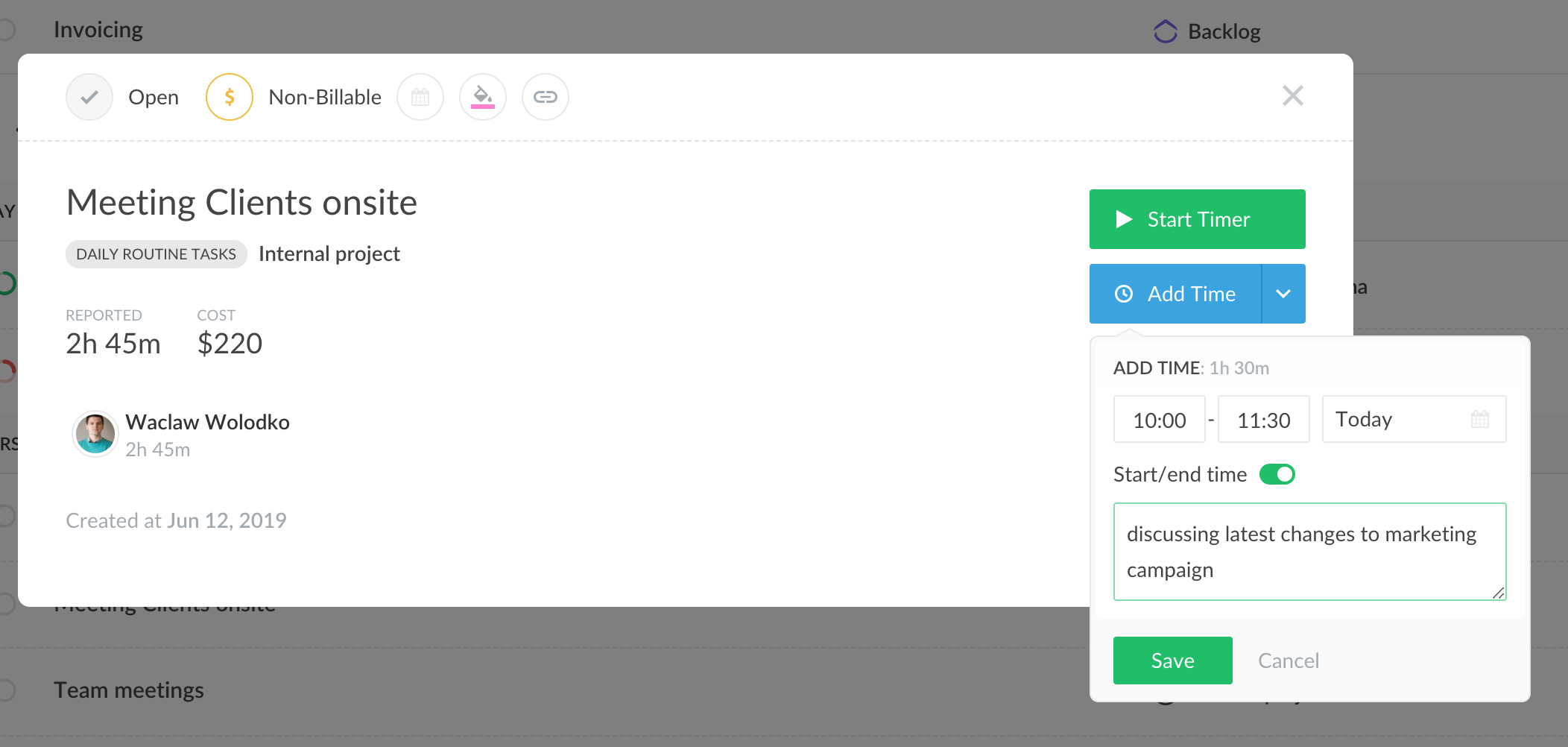 The slider also shows up in all places where you see Add Time in by clicking on a task title. It shows the hours entry by default but you are free to move the slider and switch to start/end. The hours summary will be indicated next to the popover’s title on the top.