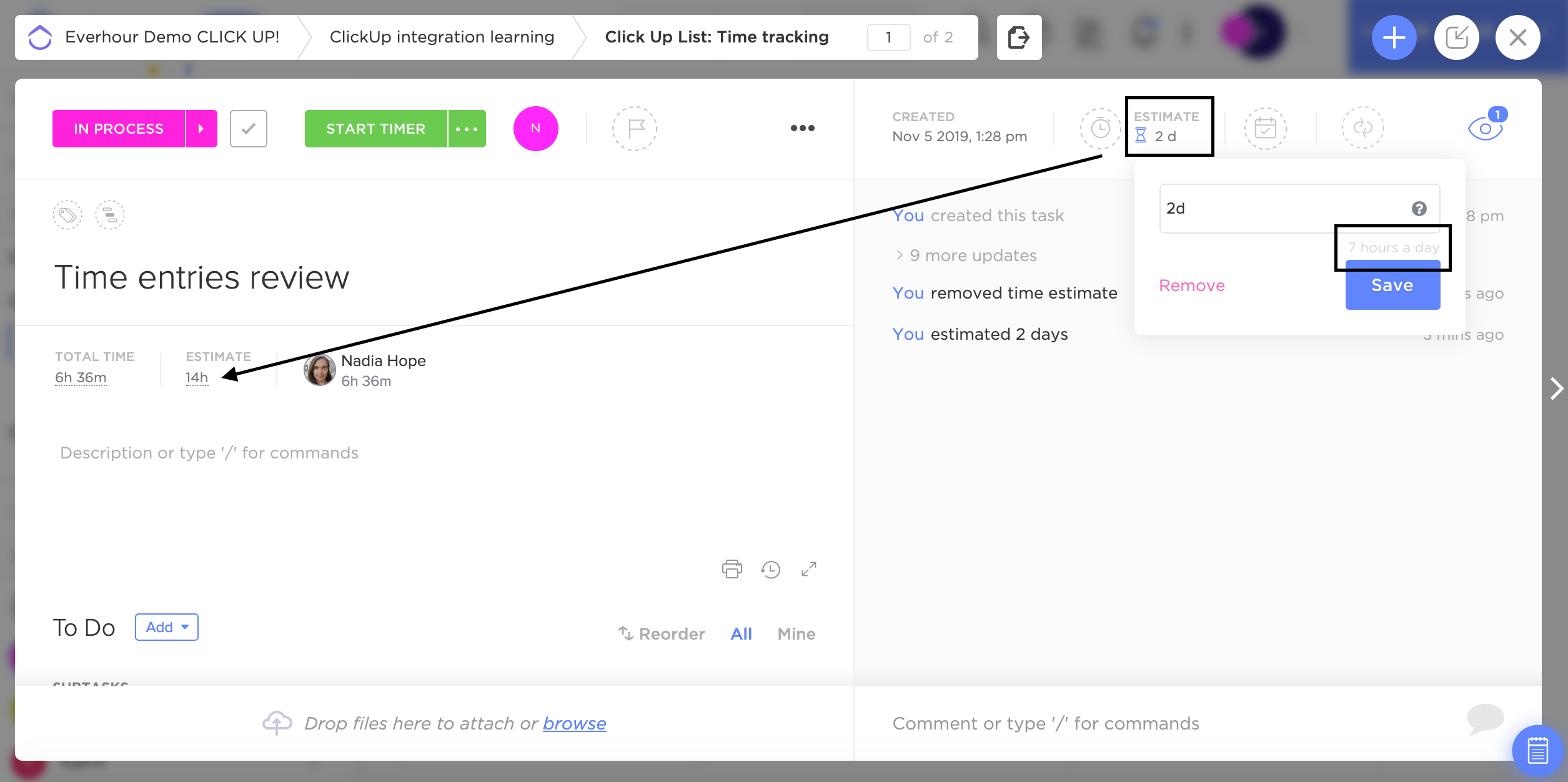 - If your ClickUp estimate is in days, it will be synced to Everhour in hours according to your ClickUp settings for a working day.