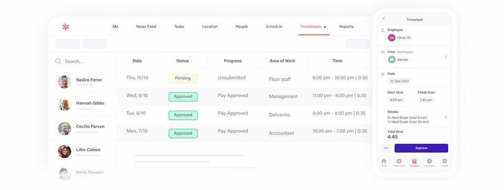 Generally, a key advantage of Deputy is that the app makes it easy for staff members to record their exact hours and breaks—users simply clock in and out of work via an on-site tablet, phone, or computer, which creates an automatic record. Plus, with GPS location stamps and facial recognition capabilities, employees can show their managers that they were in the right place at the right time. Finally, managers can save hours on employee admin by approving timesheets either individually or in bulk and exporting information to payroll software in just one tap.