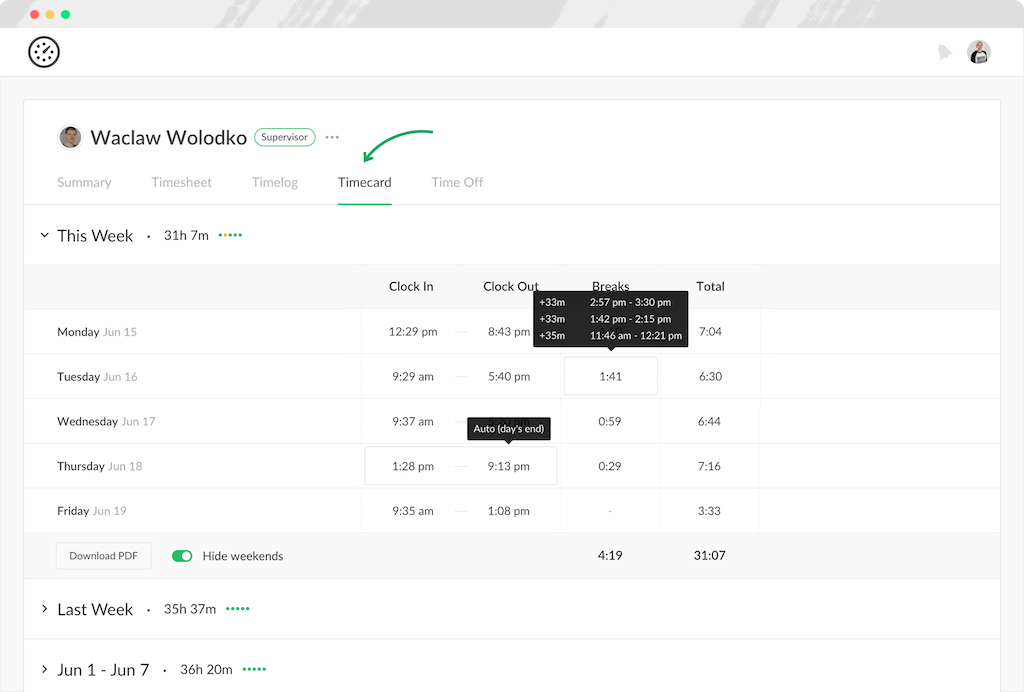 Everhour users must clock out before taking a break and clock back in when they return. Your personal Timecard displays the total breaks. The total work hours per day is the difference between the time of the first clock-in and the last clock in, minus all break time.