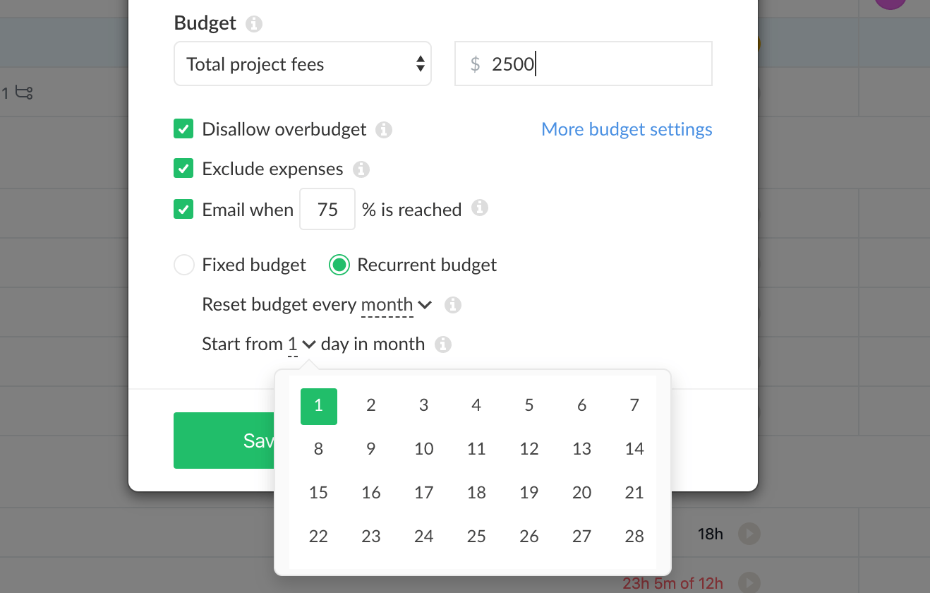 A lot of teams have projects where they spend the same number of hours every day, week or month. There is an option to set your budget repeat and see the progress towards that period.