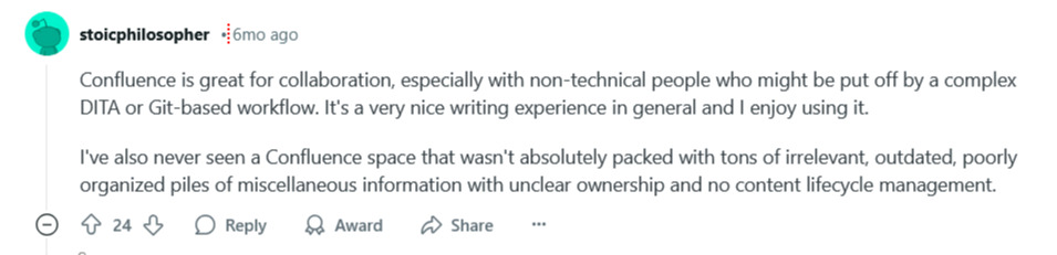 βConfluence is great for collaboration, especially with non-technical people who might be put off by a complex DITA or Git-based workflow. Itβs a very nice writing experience in general and I enjoy using it. Iβve also never seen a Confluence space that wasnβt absolutely packed with tons of irrelevant, outdated, poorly organized piles of miscellaneous information with unclear ownership and no content lifecycle management.β [Reddit comment]