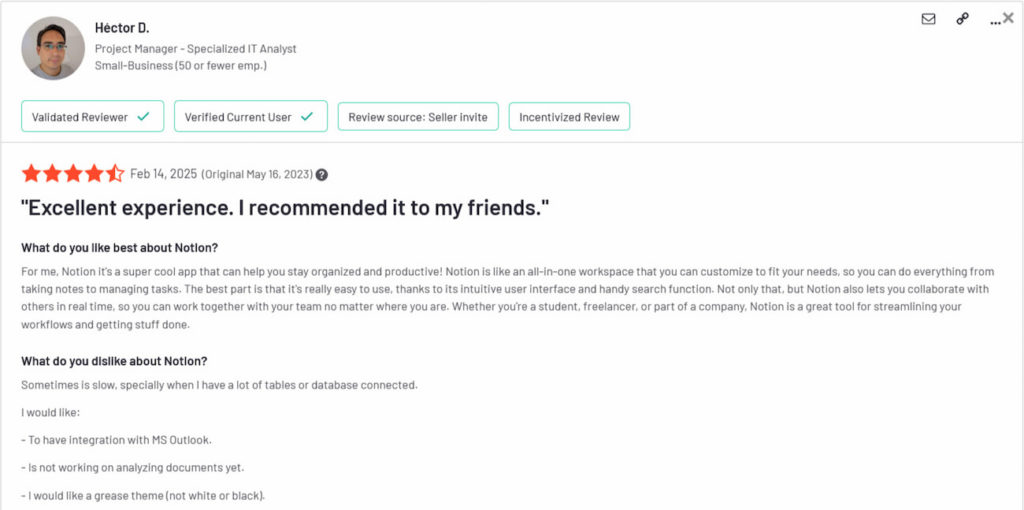 βFor me, Notion itβs a super cool app that can help you stay organized and productive! Notion is like an all-in-one workspace that you can customize to fit your needs, so you can do everything from taking notes to managing tasks. The best part is that itβs really easy to use, thanks to its intuitive user interface and handy search function. Not only that, but Notion also lets you collaborate with others in real time, so you can work together with your team no matter where you are. Whether youβre a student, freelancer, or part of a company, Notion is a great tool for streamlining your workflows and getting stuff done.β [G2 review]
