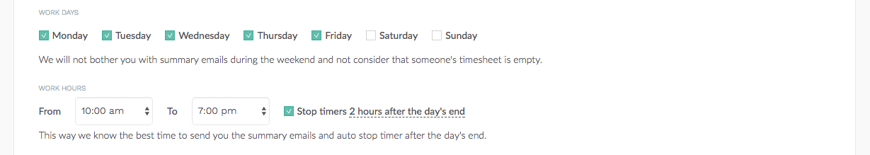 Sure, there may be cases when no one noticed that the timer of the absent colleague is running. As a result, the reported time may appear to be wrong in the final report. This is why you can now set up the usual work hours of your team. It can stop all timers automatically two hours after the defined work day’s end.