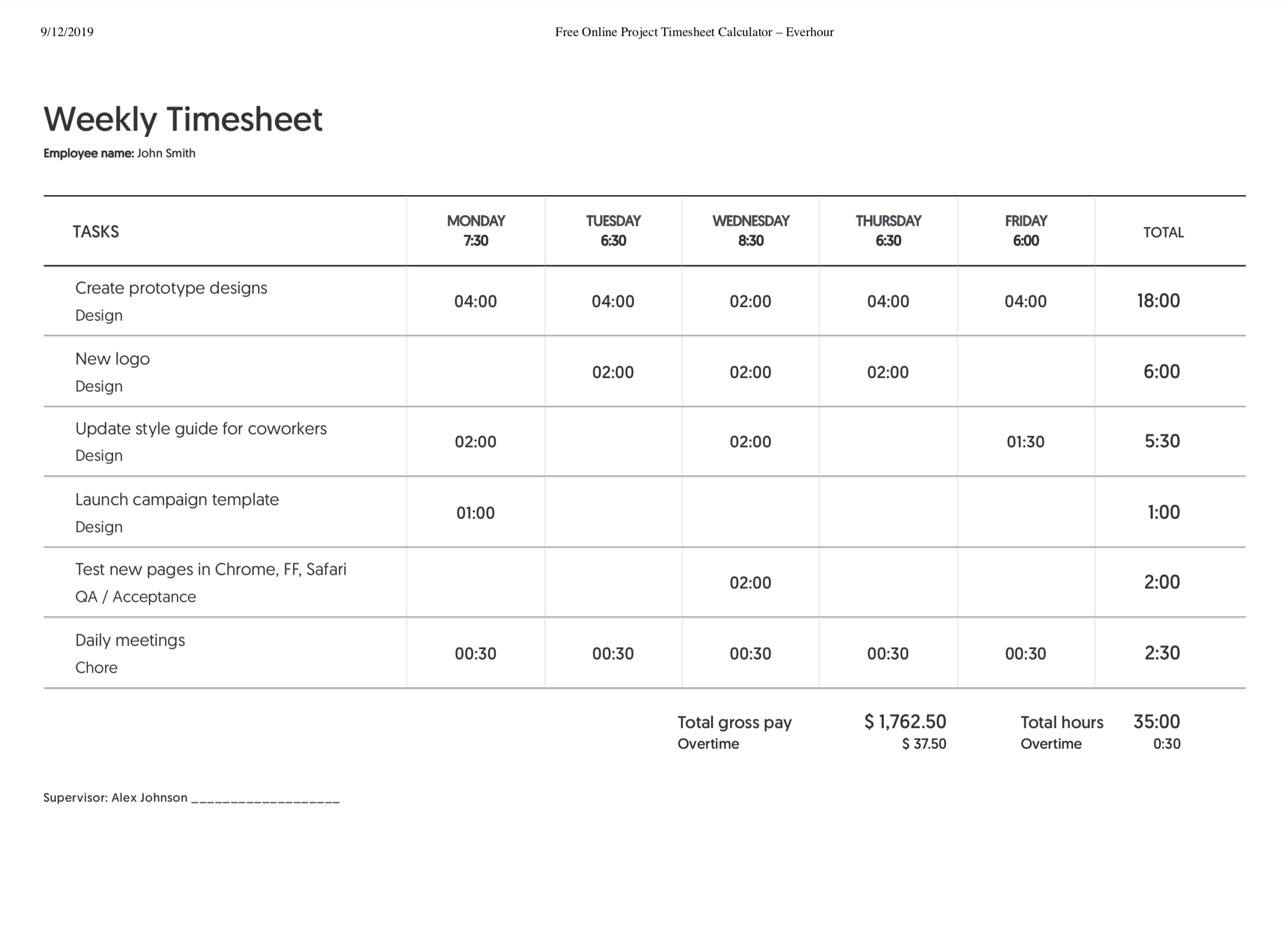 Use our online weekly timesheet to report time spent on specific tasks or activities, projects, or clients during the week. It also counts overtime and double overtime based on values entered for each day. Might be useful for reporting to clients, billing, or payroll.