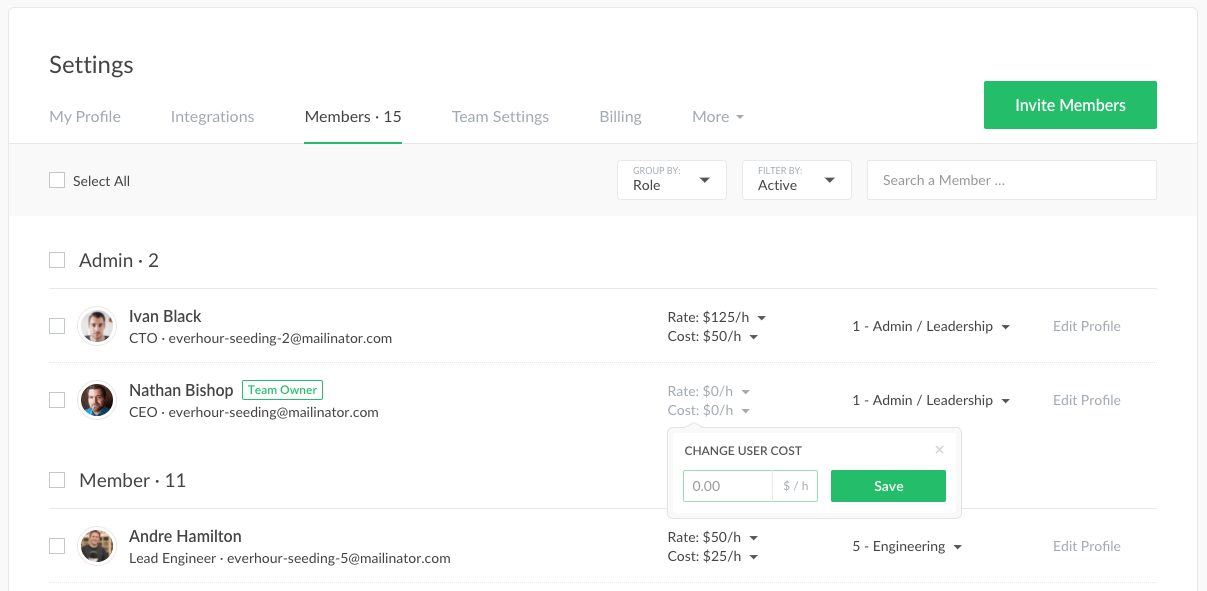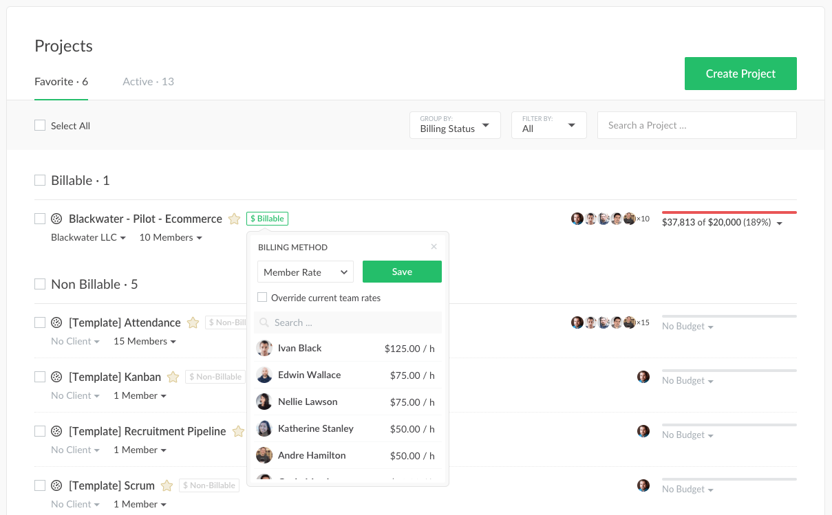 The default member rate is always located on the Member’s page. At the same time, you can set it to a unique member rate per project or per client. Make your project billable and see the option to set a project or a unique member rate.