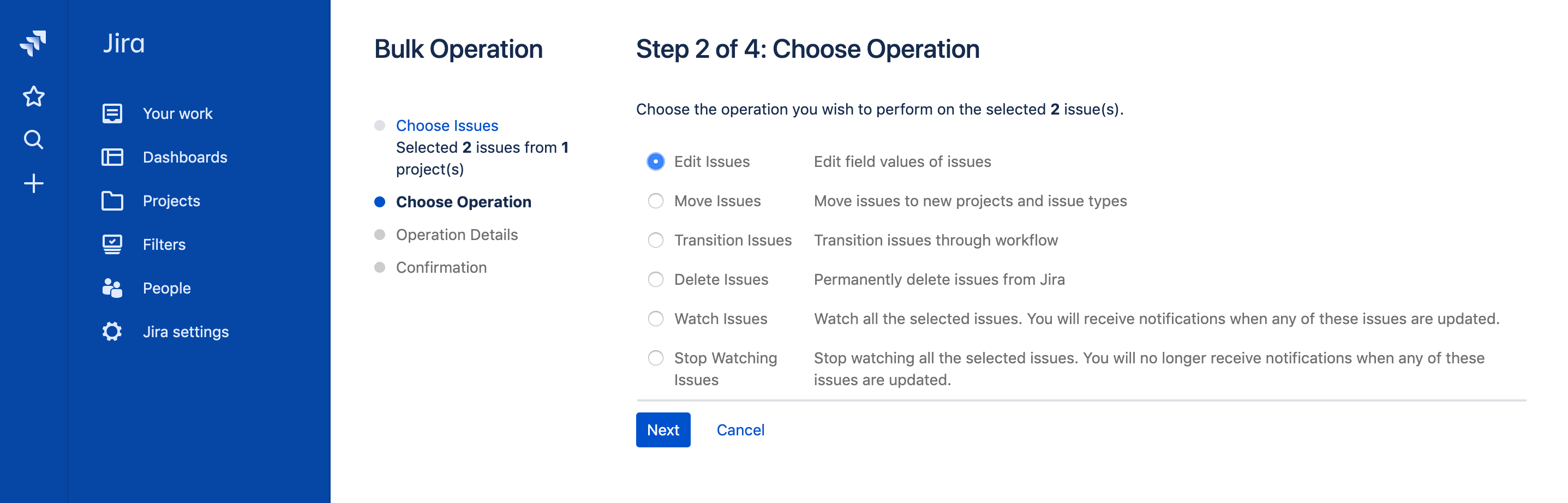 In Jira, you can edit multiple issues at once using the bulk operation feature. This allows you to transition, delete, move, and edit numerous issues all at the same time.
