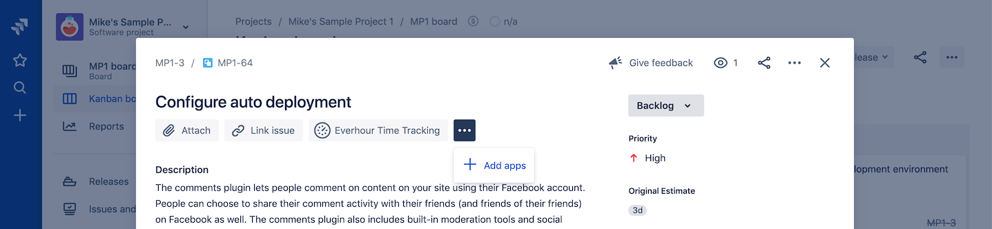 If you’re a Jira admin, you can find and try new Atlassian Marketplace apps right from the issue view. Click the “…” quick-add button under the issue summary and choose Add apps.