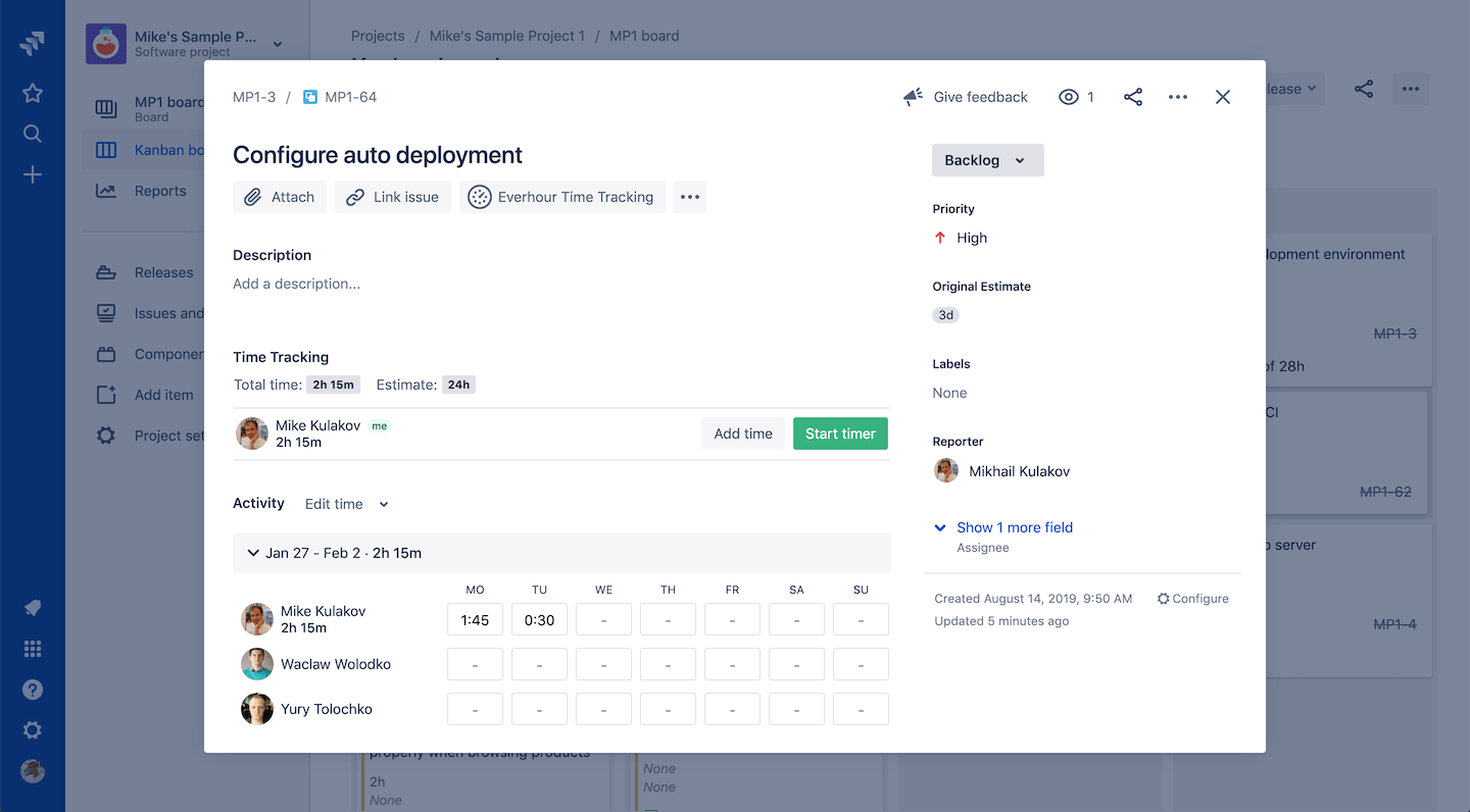 And this is how the Jira issue looks like after installing the Everhour Jira plugin.