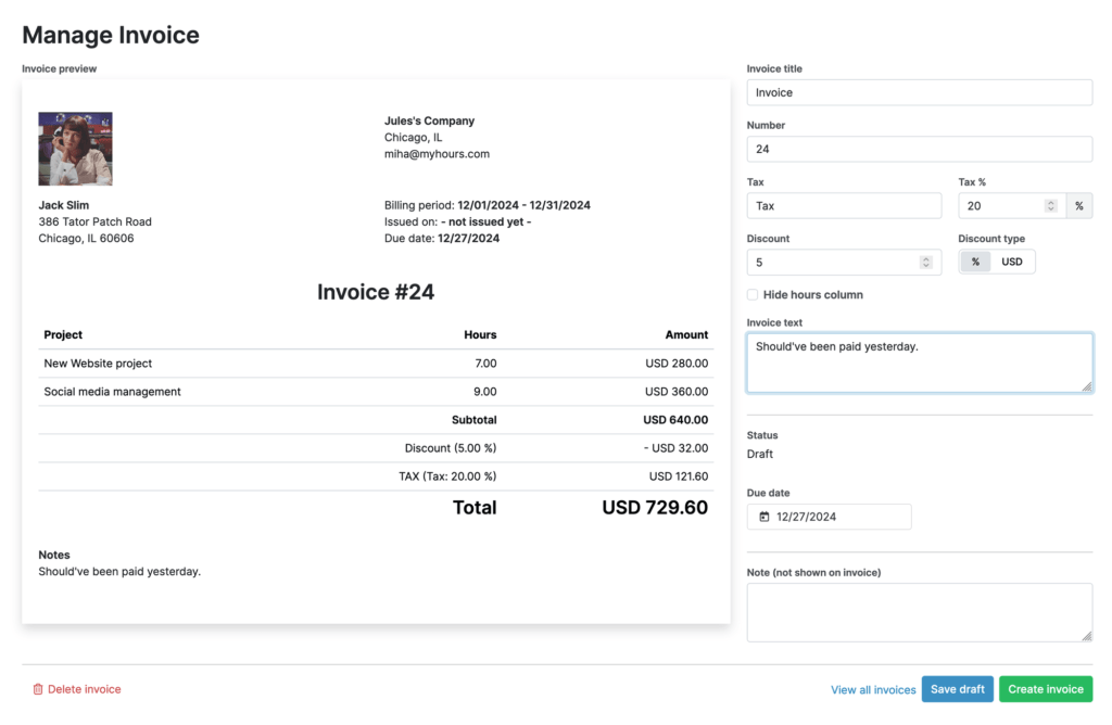 Built-in invoicing based on tracked time.