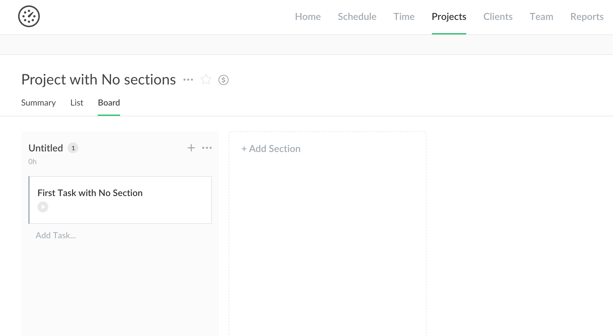Existing projects don’t let you create sectionless tasks on the fly, but you can simply drag and drop a task from any section at the top. On the board view, the “Untitled” section will be created.