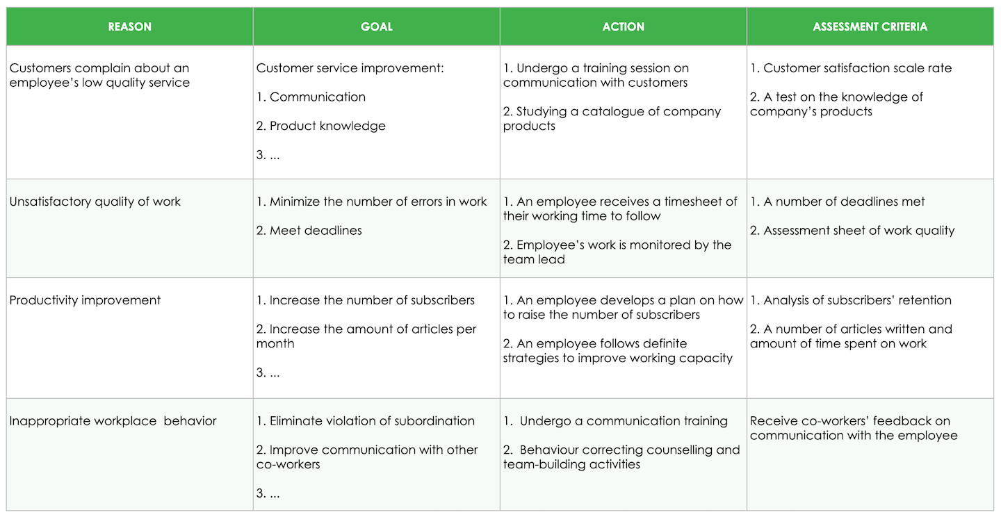 You already know the stages you should follow when writing a performance improvement plan. Letâs have a look at its structure.