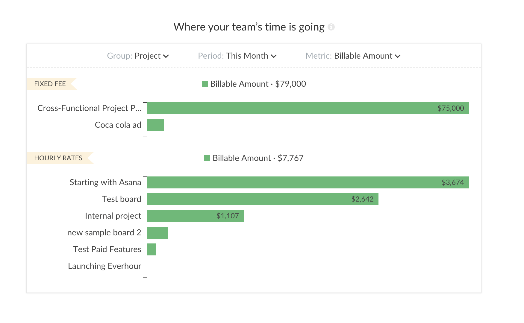 Summary dashboards of fixed projects show the total billable amount and 0 for all particular periods.