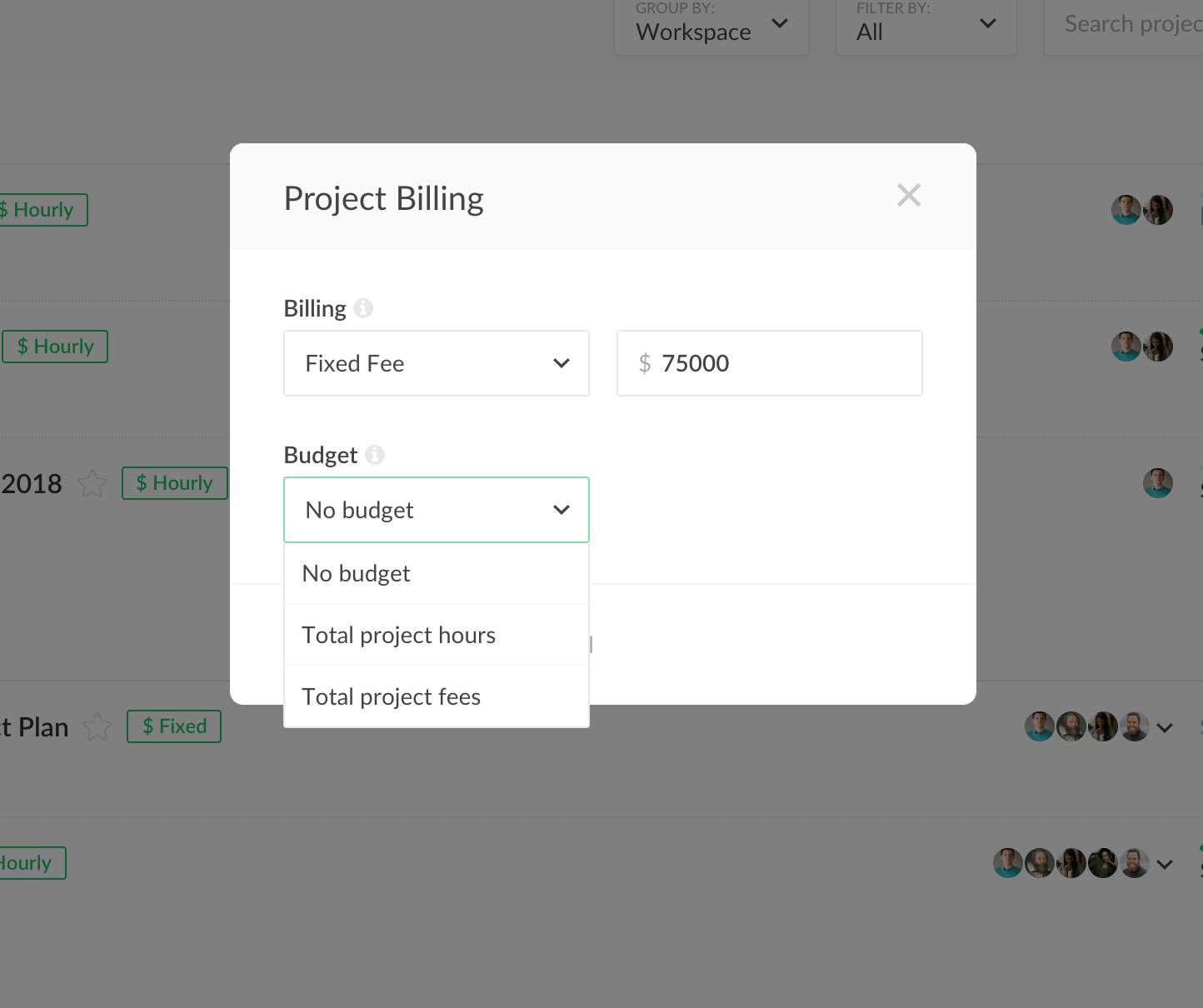 We have combined the budget and billing method option to manage under one modal. For billing, the choices are: