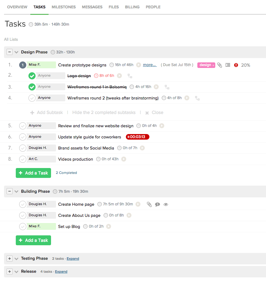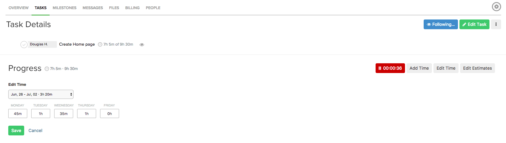 Below is the list of tasks (one of the most important pages) in Teamwork. And how a native time tracking component looks and feels.