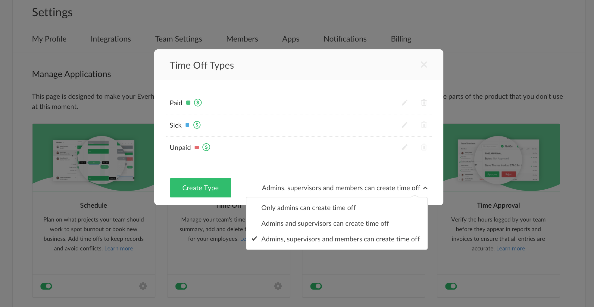 One of the Everhour team admins needs to go to the Applications page, open the settings of the Time Off app and choose those who will be able to request time off events.