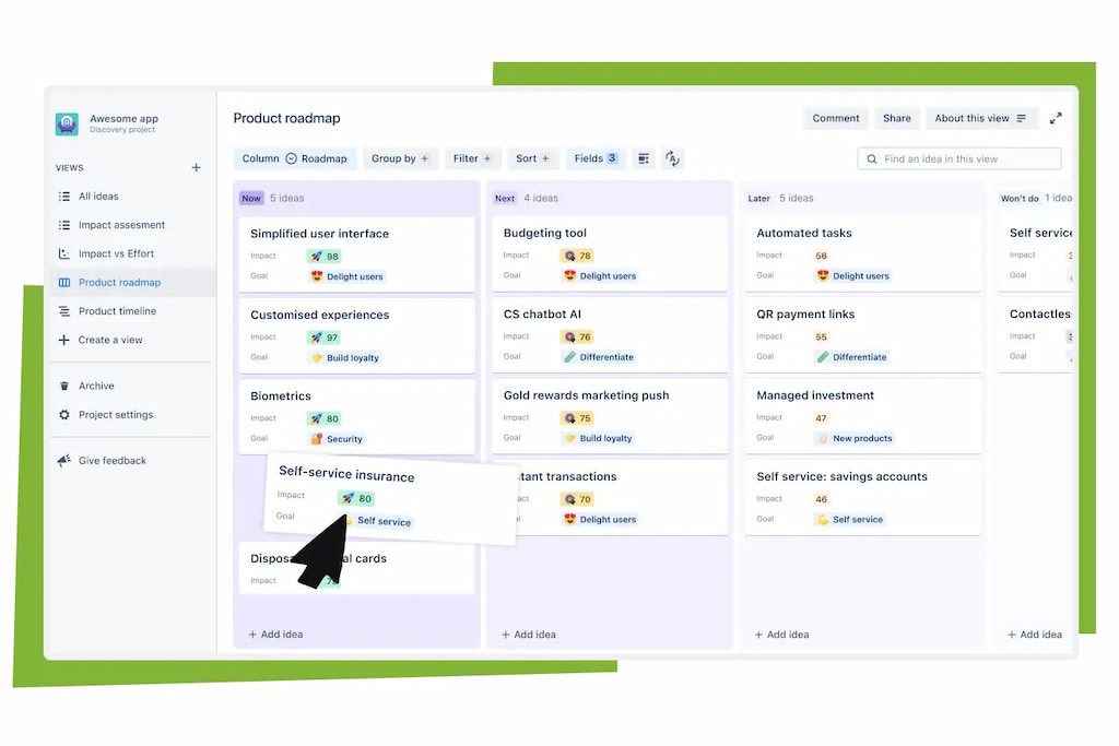 Teams can group and filter ideas by fields such as impact, effort, strategic goals, or product area. This makes it easier to understand which ideas bring the most value and how they fit into the broader product strategy.