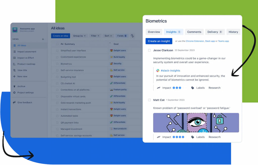 Teams can attach insights to ideas, including customer feedback, research notes, usage data, or internal discussions. This helps product managers support prioritization decisions with evidence and maintain a clear connection between user needs and product development.
