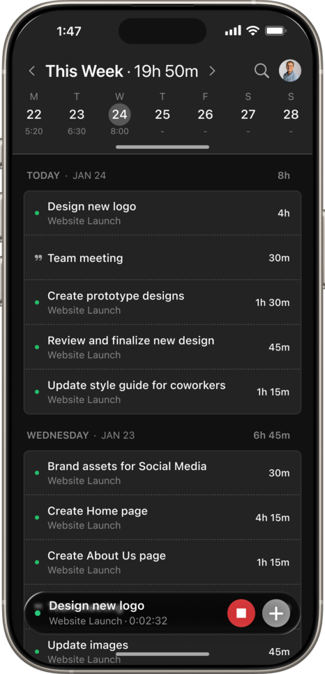 The mobile app is a streamlined version designed for everyday time tracking: starting timers, adding time, browsing entries, and checking monthly summaries. For full project, task, and client management you will still need the web version.